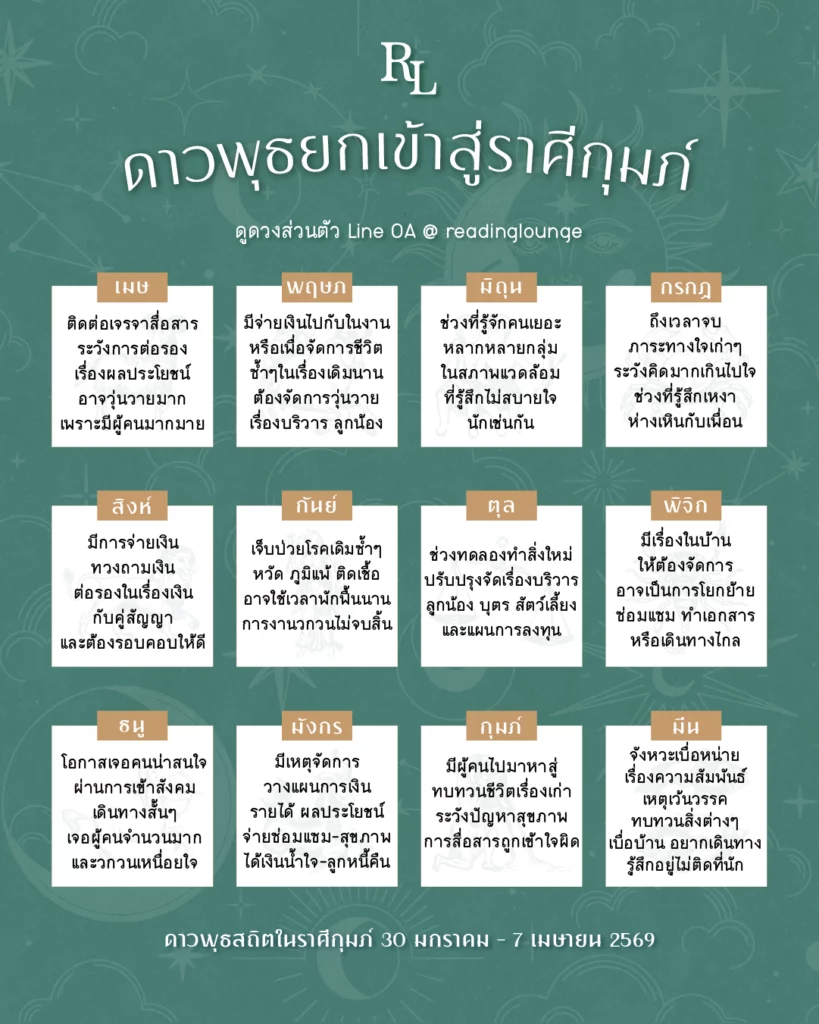 ดาวพุธยกเข้าสู่ราศีกุมภ์ 30 มกราคม – 7 เมษายน 2569